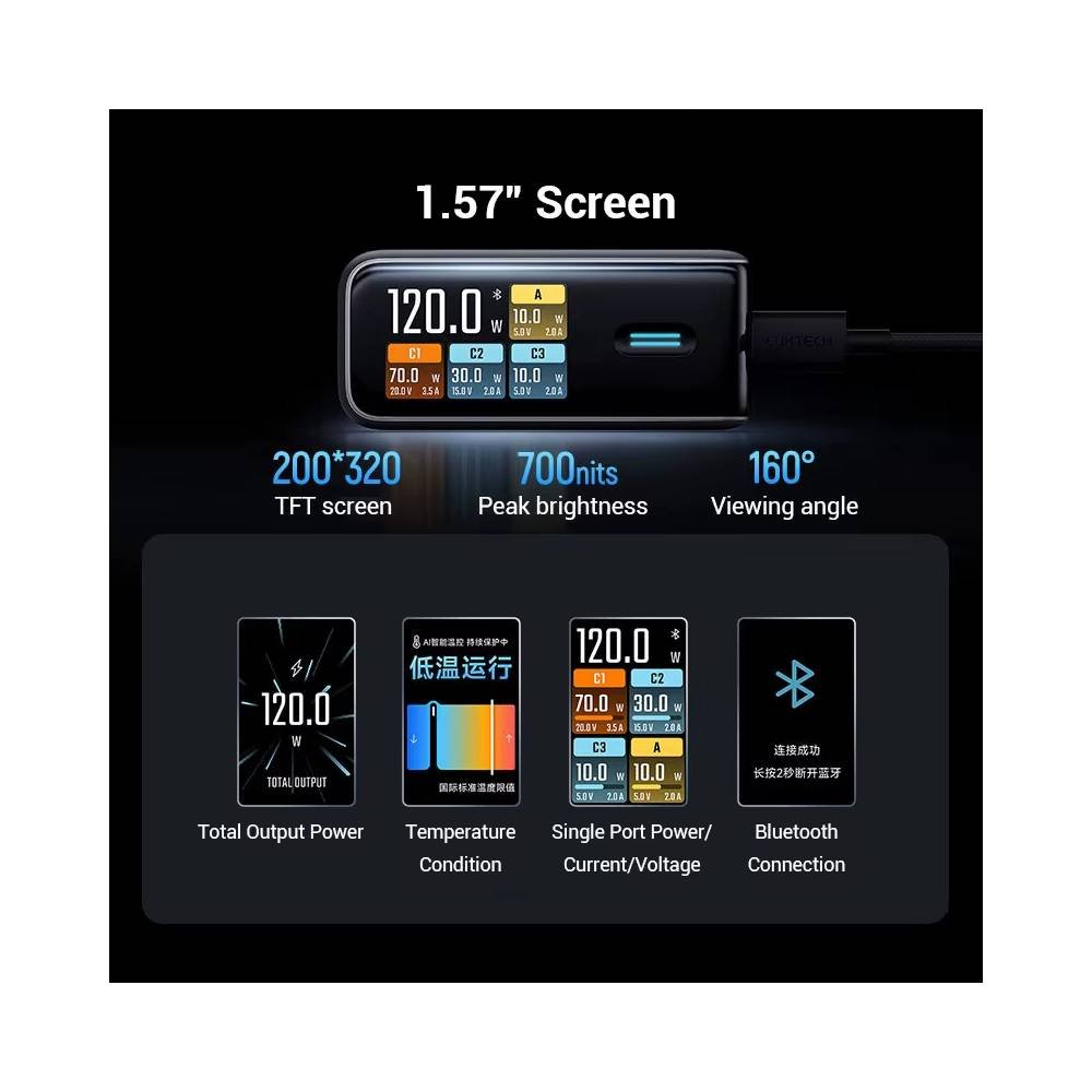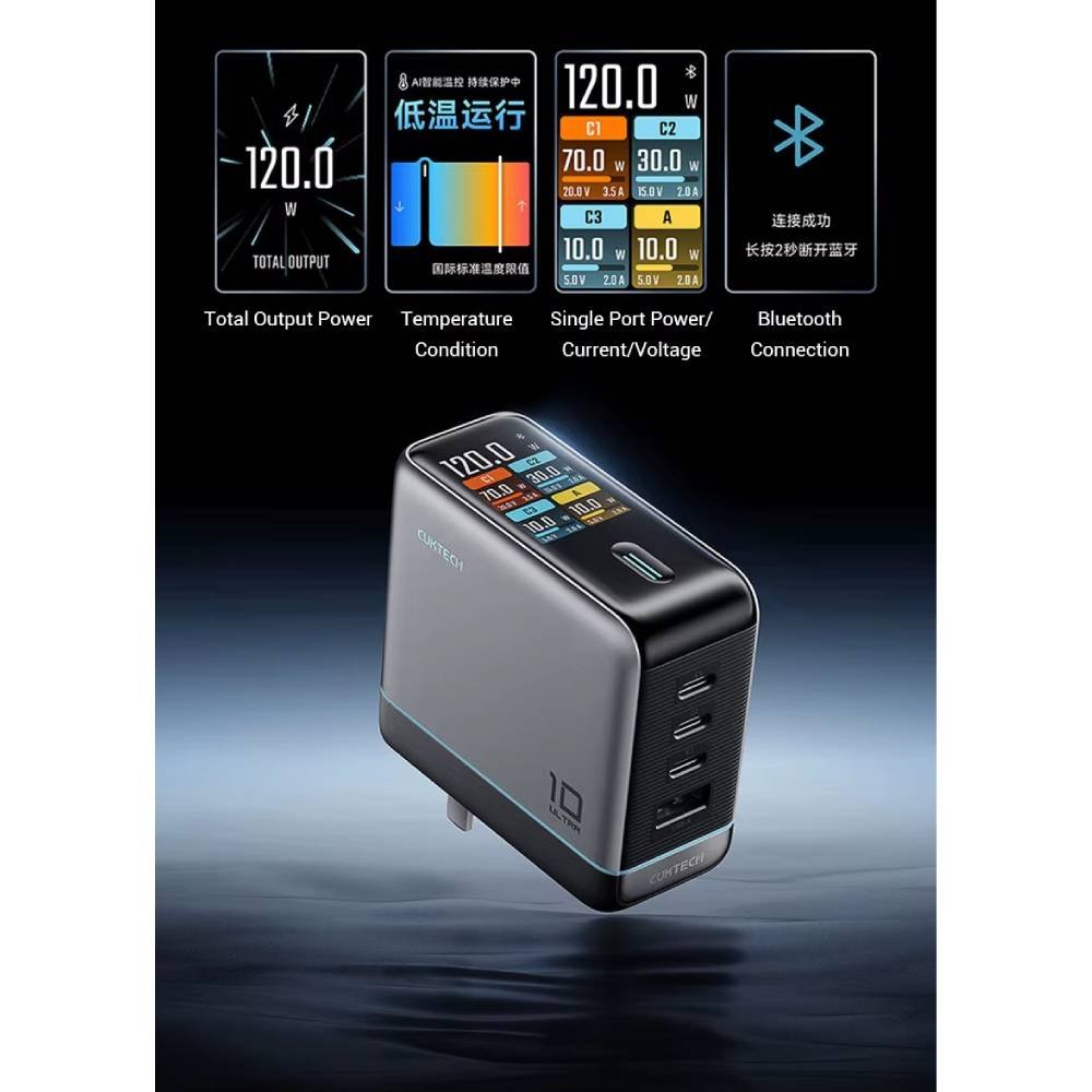 El CUKTECH 10 Ultra AD1204U es un cargador GaN de gama alta que destaca por su potencia de hasta 120W, su pantalla LCD integrada y su conectividad con aplicación inteligente. Es ideal para usuarios que necesitan cargar múltiples dispositivos al mismo tiempo, incluyendo laptops y smartphones de carga rápida. Su diseño compacto, junto con funciones avanzadas de monitoreo y control, lo convierten en una opción premium para escritorio o viajes.